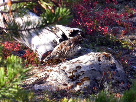 Along with untouched wilderness comes wildlife ... of which there is plenty of variety in the far north. Here, a Willow Ptarmigan ("Riekko") pretends to be invisible in the northern forests of the Ivalo region.
